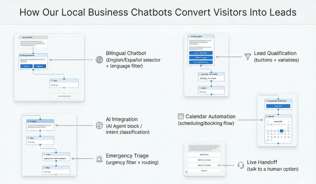 You don’t need theory—you need proof that the system works in the real world. Below are screenshots from actual chatbot builds showing how we implement bilingual routing, AI integration, calendar automation, and live handoff logic.