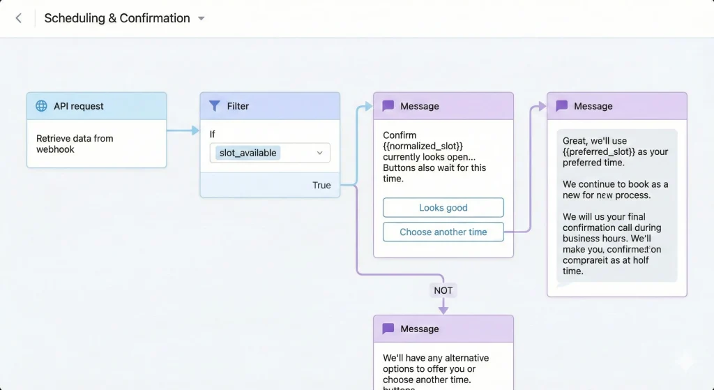 We don’t rely on rigid scripts alone. We use AI Agents to classify intent and route visitors to scheduling or emergency handling.