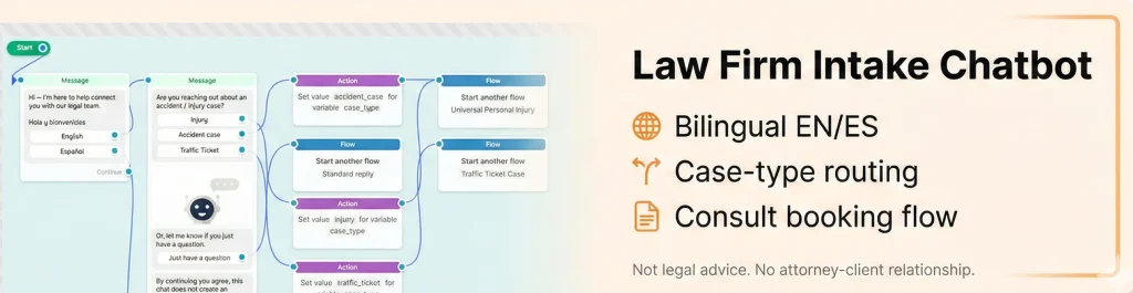 We build flows that protect your time and your license. This example shows a bilingual welcome, automatic routing based on case type, and a critical legal disclaimer.